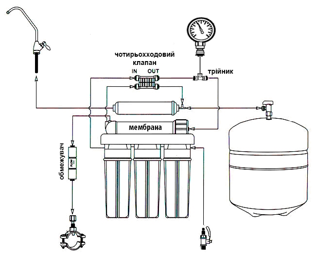 2. Під час набору накопичувального баку відбувається процес фільтрації і манометр відображає певний тиск води на мембрану. Після заповнення накопичувального баку, чотирьохходовий клапан повинен перекрити подачу води на мембрану і процес фільтрації (а також злив води в дренаж) повинен зупинитися. При цьому показники манометру мають знизитися до нуля. Якщо, в процесі експлуатації фільтру, Ви помітили, що показники манометру ніколи не знижуються до нуля, це означає несправність чотирьохходового клапану, а це означає, що злив води в дренаж ніколи не припиняється.